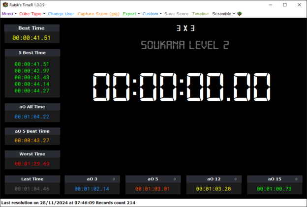 Welcome to Rubik’s TimeR, the ultimate application for measuring your cube-solving performances! With a user-friendly interface and advanced features, Rubik’s TimeR provides you with an optimal timing experience.